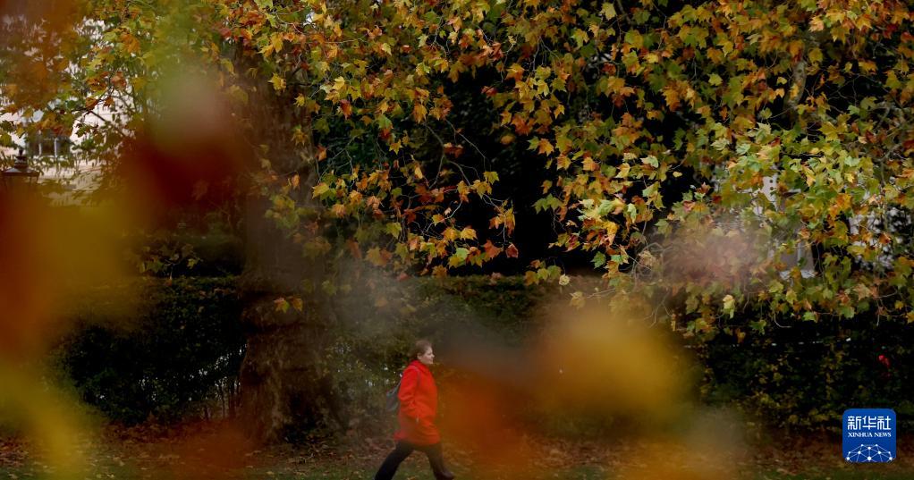 10月27日,一名女子手推婴儿车走在英国伦敦摄政公园。