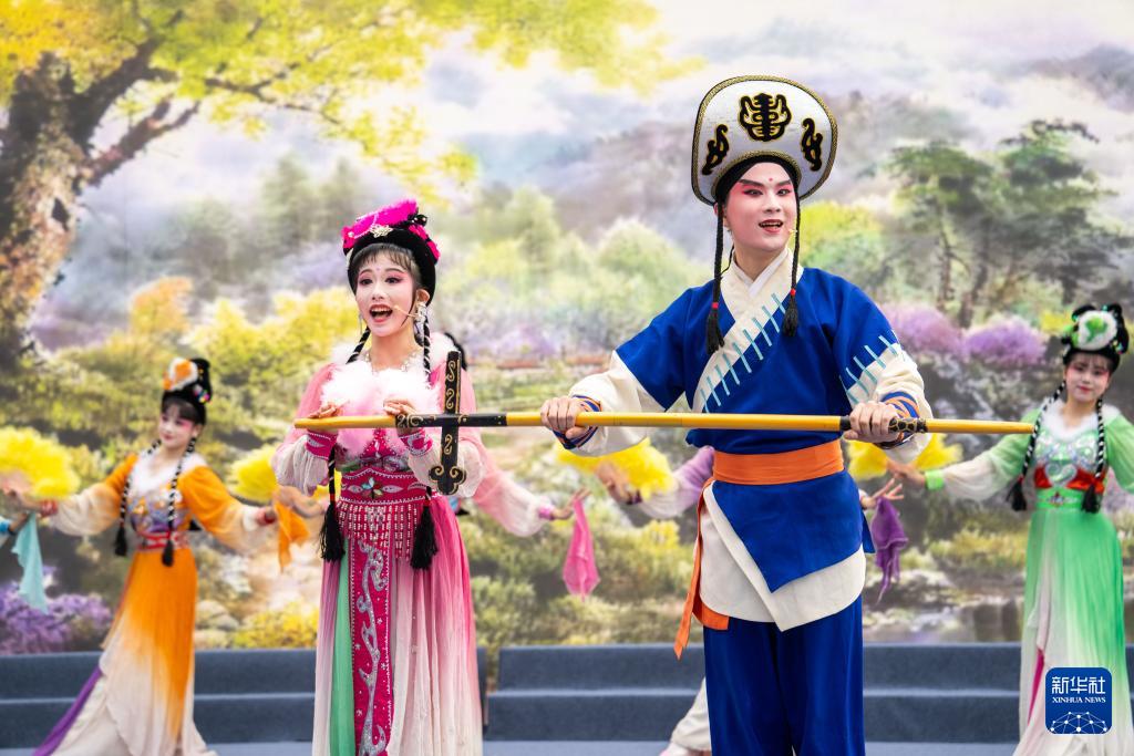 10月29日,在长沙市开福区东风路街道东风大舞台,湖南艺术职业学院学生为市民表演戏曲《刘海砍樵》。
