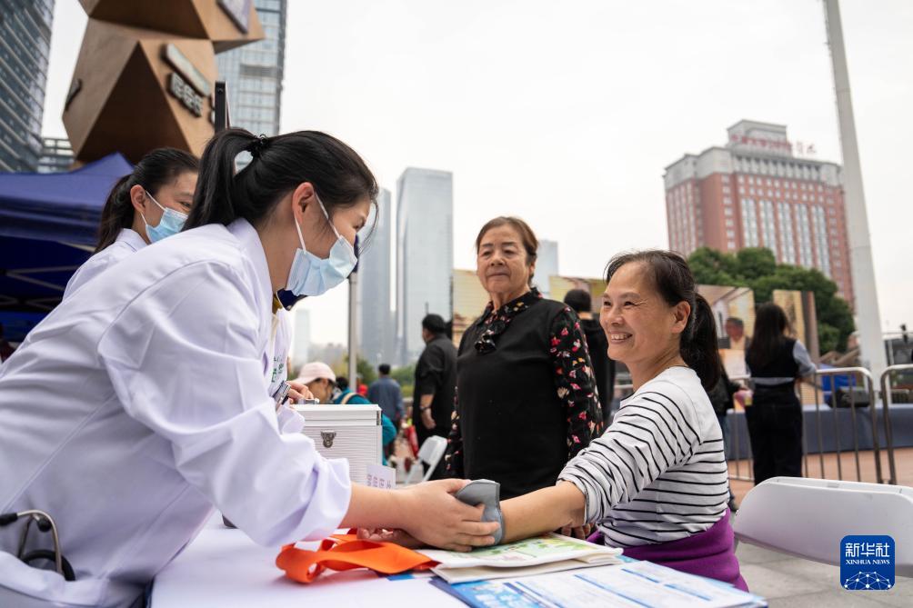 10月29日,在长沙市开福区东风路街道东风大舞台旁,市民参加义诊活动。