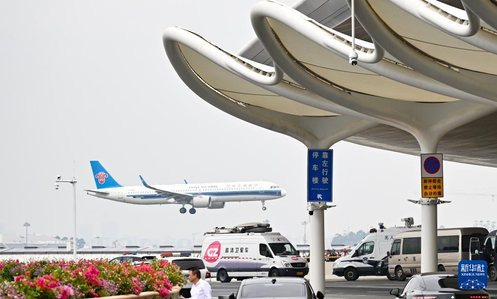 10月30日,在广州白云机场T3航站楼外,远处一架客机在降落。