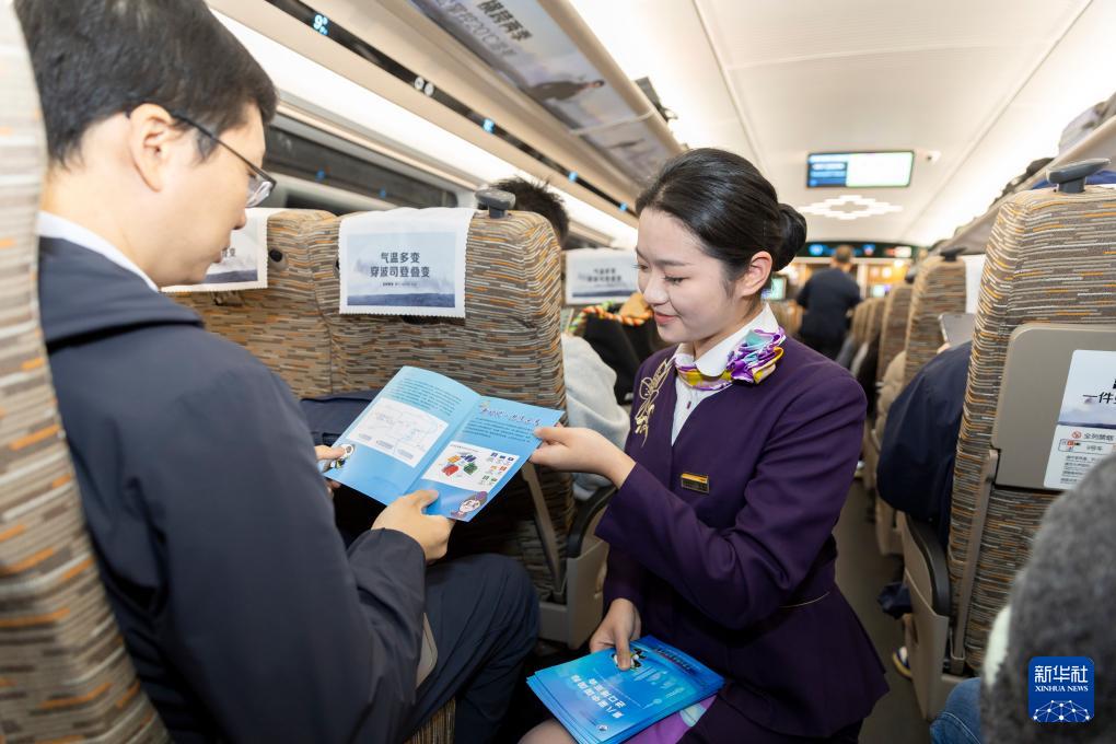 10月30日,上海客运段列车员在车厢内为旅客派发进博宣传册。