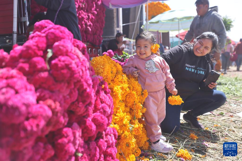 10月29日,在墨西哥首都墨西哥城的供应中心,儿童在出售亡灵节鲜花的摊位旁玩耍。