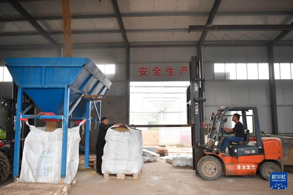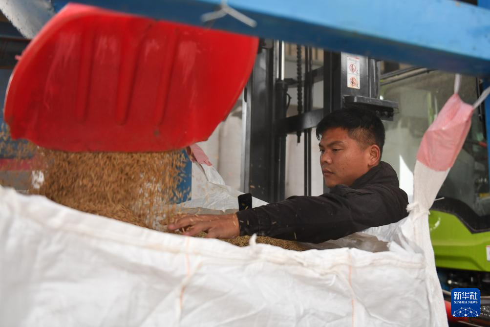 10月30日,邱彬(左)和父亲邱国清将烘干后的稻谷装袋。
