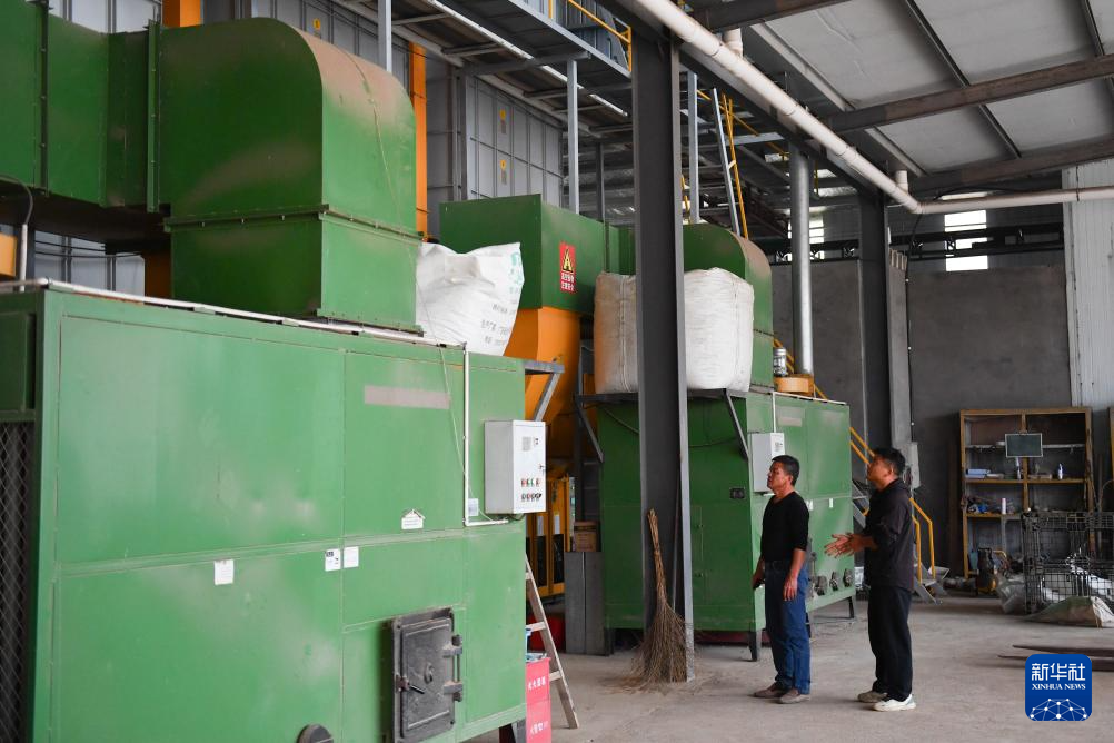 10月29日,邱彬(右)和父亲邱国清在查看烘干机运行情况。