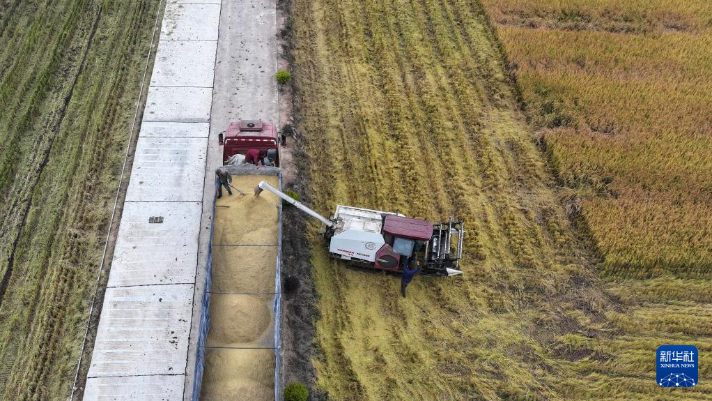 10月29日,在大通湖区河坝镇王家湖村,农机手驾驶收割机将稻谷装车(无人机照片)。