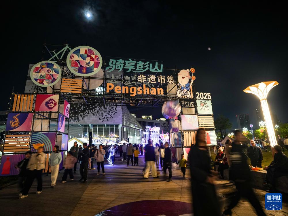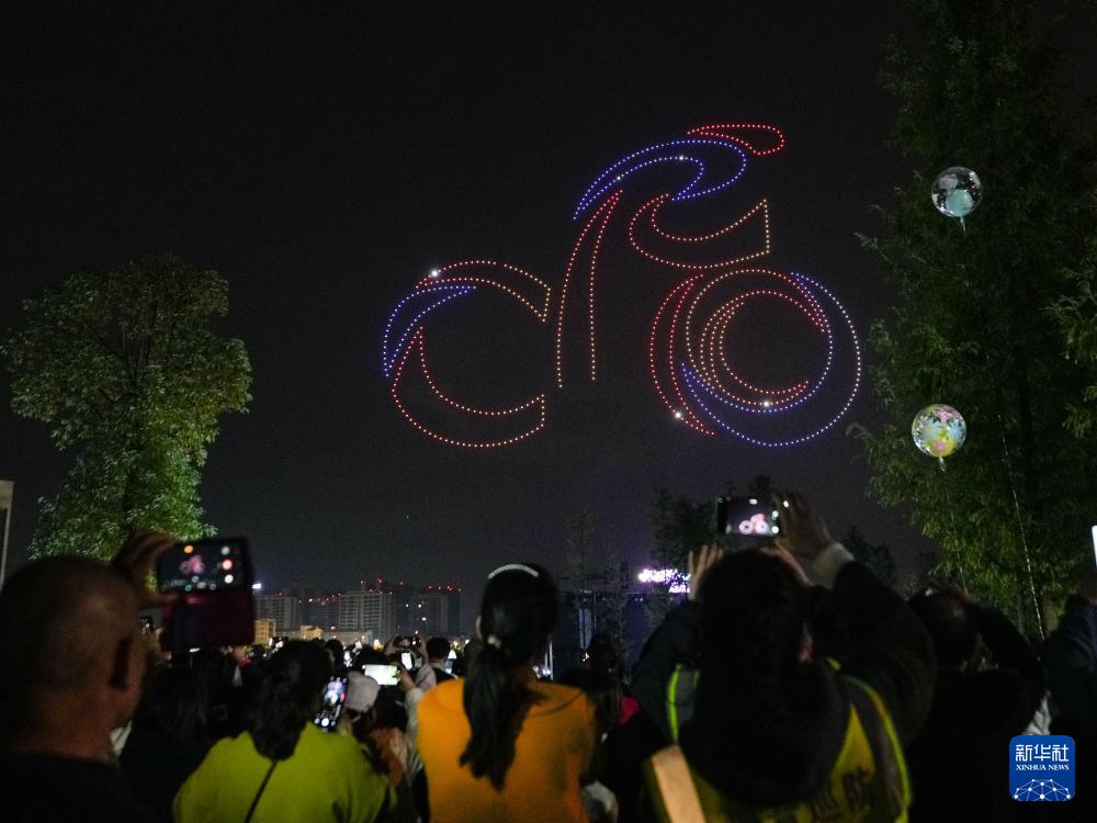 11月1日晚,2025中国公路自行车公开赛(眉山彭山站)开赛前夜,一场无人机表演点亮四川省眉山市彭山区的夜空,当地群众在非遗市集和主题音乐会等多元文化活动中享受惬意的周末时光。