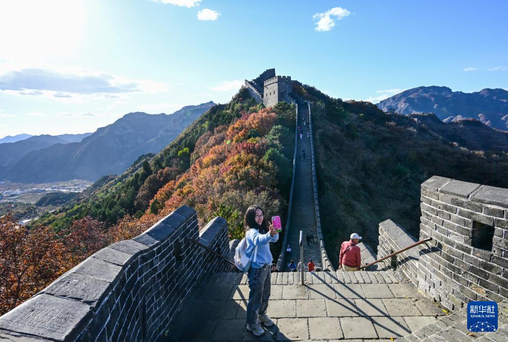 11月1日,游客在位于天津市蓟州区的黄崖关长城上自拍。