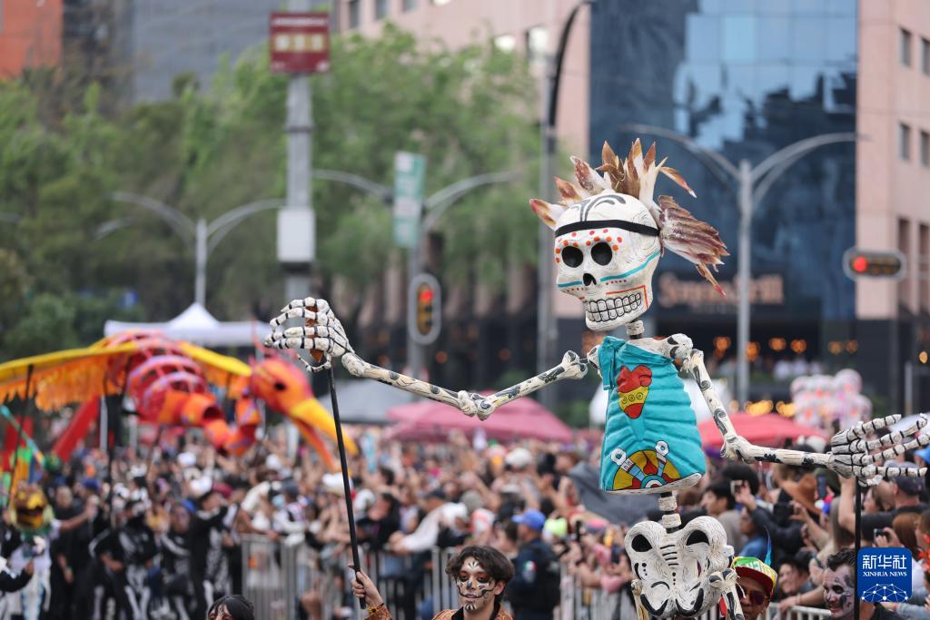 11月1日,在墨西哥首都墨西哥城,演员举着亡灵节装置参加游行。