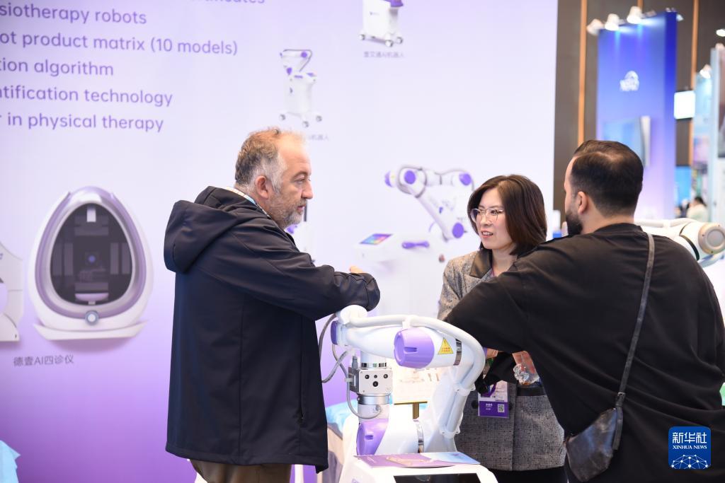 11月3日,客商在广交会展馆了解一款理疗机器人。