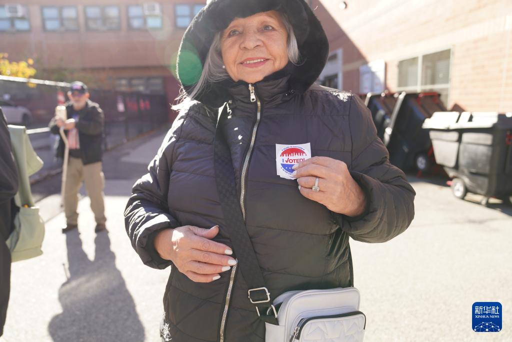11月4日,在美国纽约市的一个投票站,一名女士展示已投票标志。