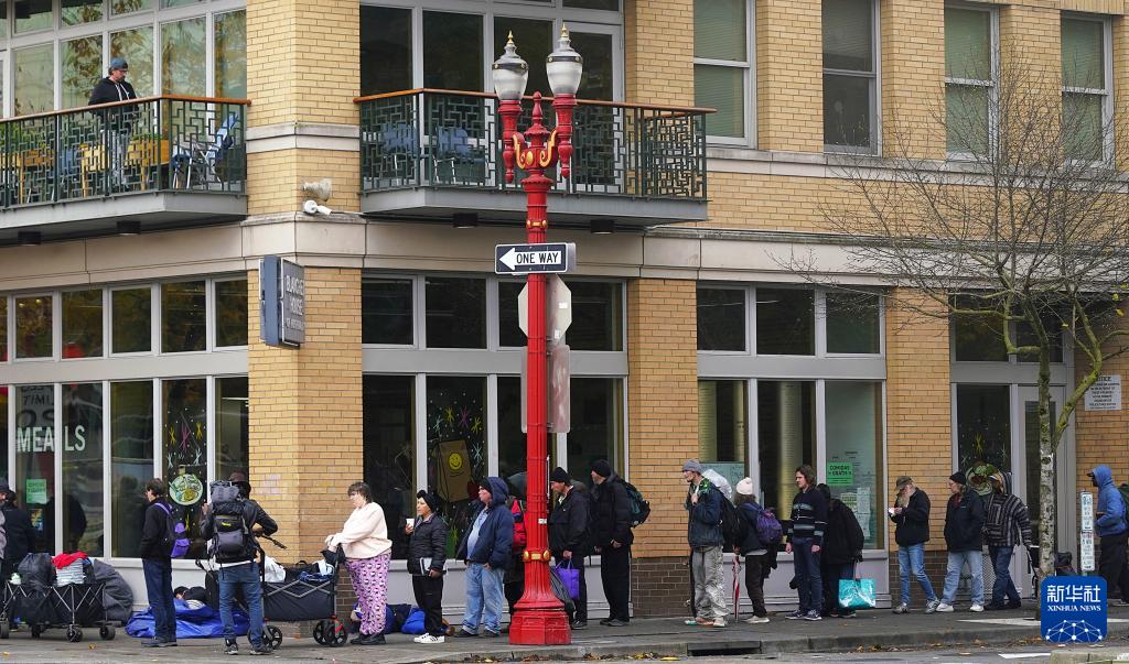 11月4日,在美国俄勒冈州波特兰,等待领取免费食物的人们在街头排起长队。