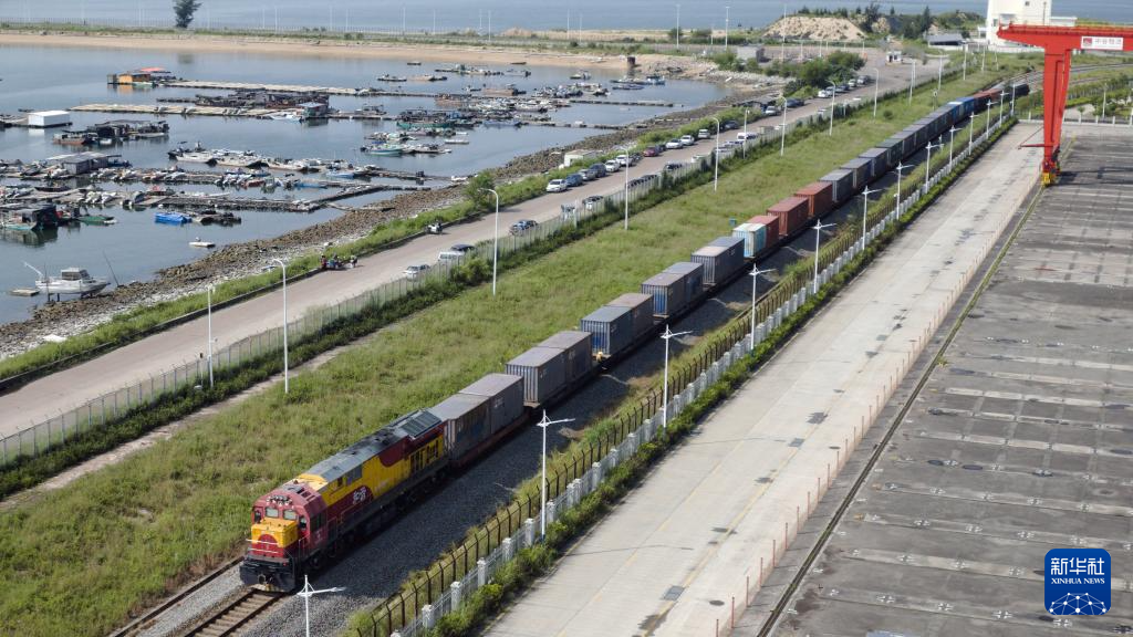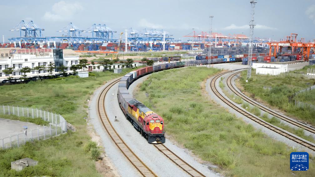 满载集装箱的班列驶向广西钦州港东站(9月19日摄,无人机照片)。