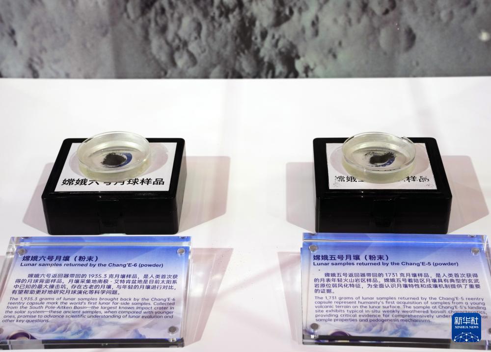 这是11月5日在第八届进博会国家展中国馆拍摄的嫦娥五号月壤和嫦娥六号月壤。