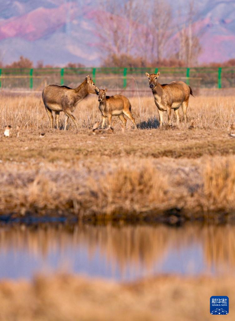 青铜峡库区湿地自然保护区总面积174.93平方公里,是宁夏最大的黄河滩涂类型湿地。2024年9月底,35头麋鹿落户青铜峡库区湿地自然保护区,经过一个月适应期后被野放在200余亩的围栏内。目前,随着6只麋鹿幼崽的诞生,当地麋鹿种群繁育工作迈入新阶段,放归区域从200余亩扩展至3000余亩,保护工作也从迁地扩繁转向野化放归,开启了黄河流域宁夏段生物多样性保护的新篇章。