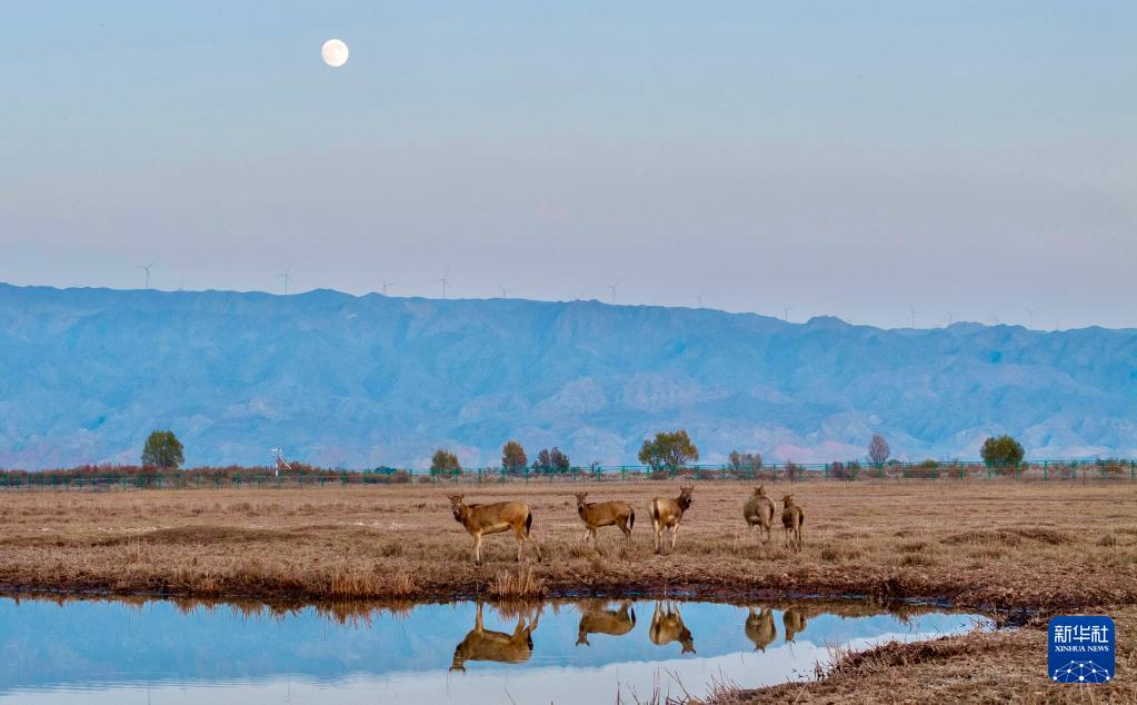 青铜峡库区湿地自然保护区总面积174.93平方公里,是宁夏最大的黄河滩涂类型湿地。2024年9月底,35头麋鹿落户青铜峡库区湿地自然保护区,经过一个月适应期后被野放在200余亩的围栏内。目前,随着6只麋鹿幼崽的诞生,当地麋鹿种群繁育工作迈入新阶段,放归区域从200余亩扩展至3000余亩,保护工作也从迁地扩繁转向野化放归,开启了黄河流域宁夏段生物多样性保护的新篇章。