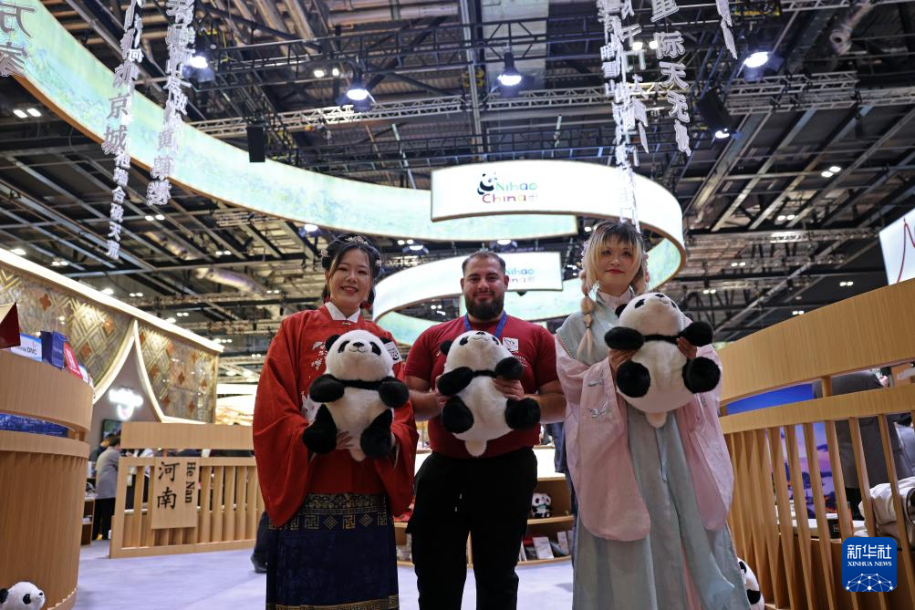 11月4日,一名男子在2025伦敦世界旅游交易会中国展区与工作人员合影。