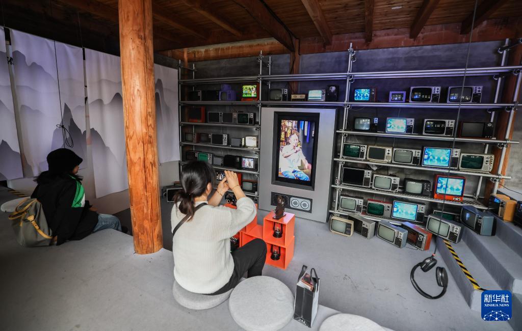 11月5日,游客在濮院时尚古镇的互联网生活嘉年华观看老旧电视机播放的濮院传统生活场景。