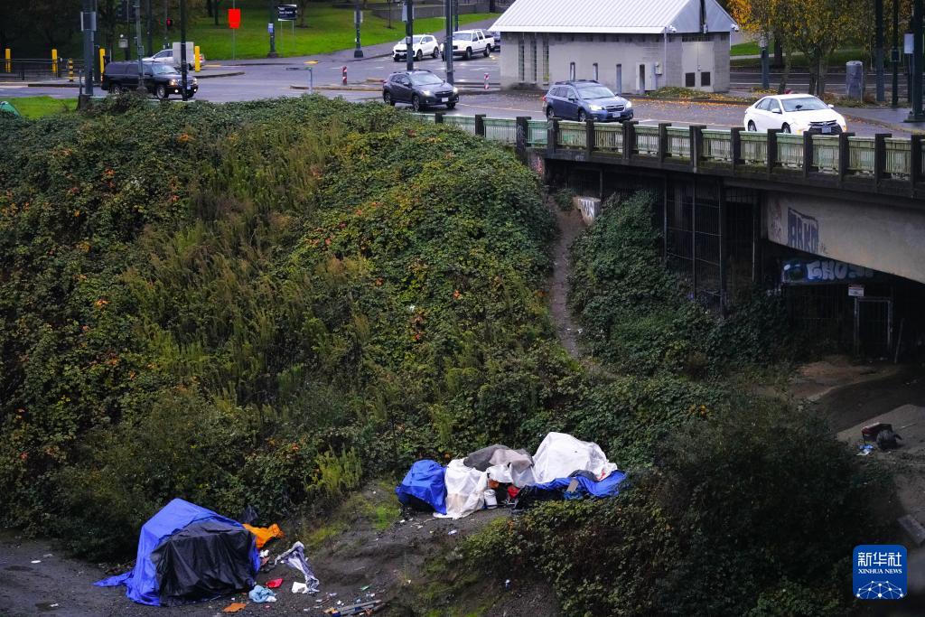 这是11月5日清晨在美国俄勒冈州波特兰拍摄的公路桥下的无家可归者栖身的帐篷。