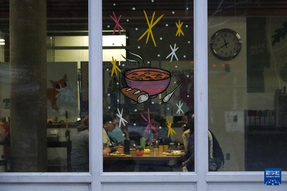 11月5日清晨,在美国俄勒冈州波特兰街头,无家可归者在免费领取食物的机构内用餐。