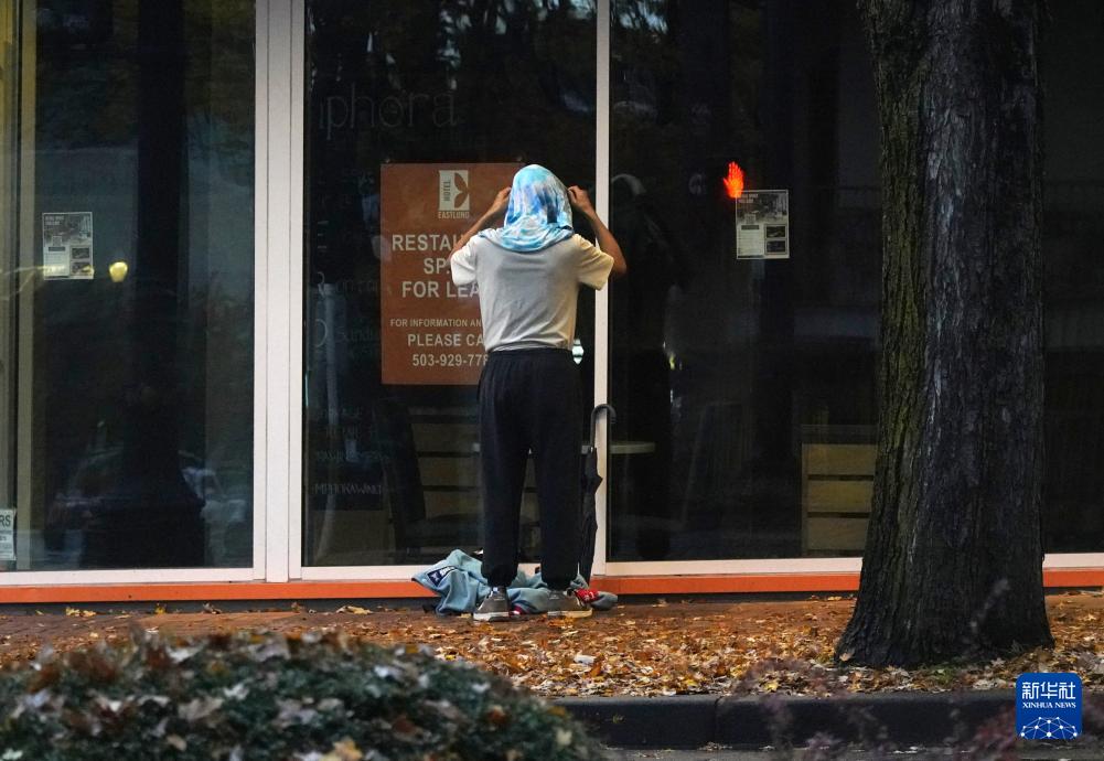 11月5日清晨,在美国俄勒冈州波特兰的深秋寒意中,无家可归者在街头换衣服。