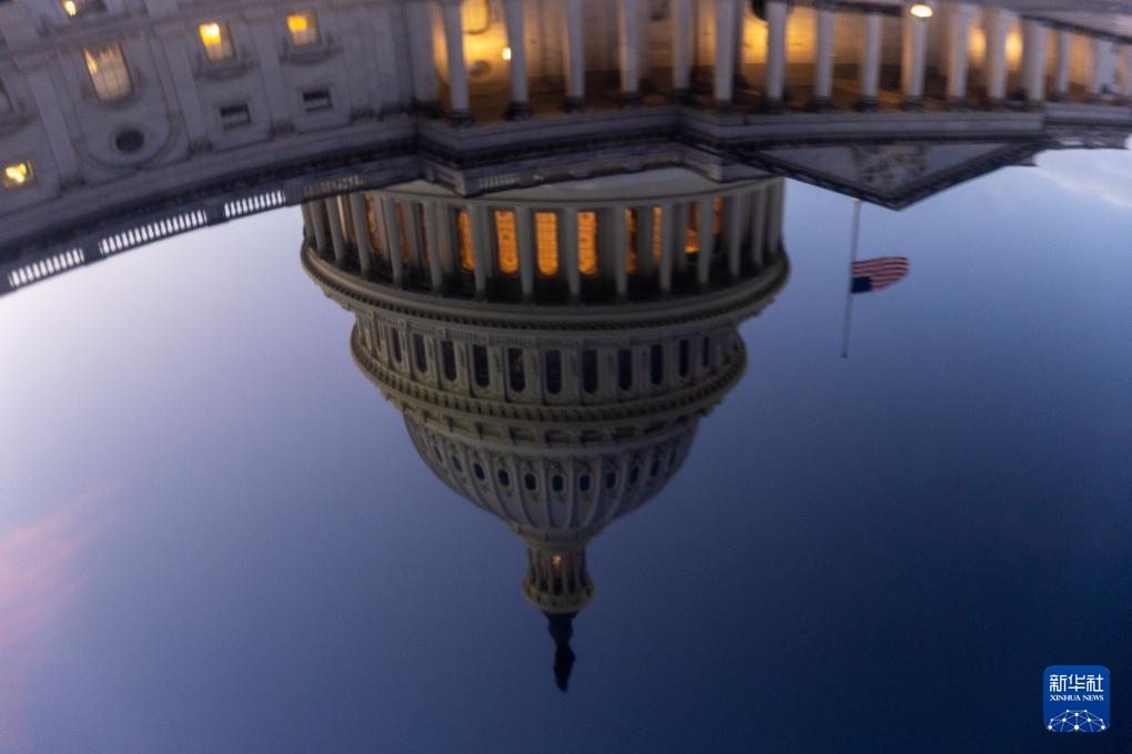 这是11月5日在美国首都华盛顿拍摄的汽车引擎盖上的美国国会大厦倒影。