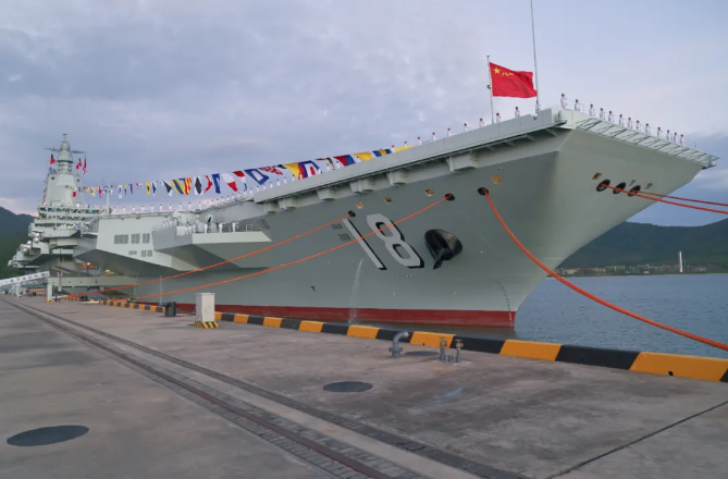 11月5日,我国第一艘电磁弹射型航空母舰福建舰入列授旗仪式在海南三亚某军港举行。福建舰是我国第一艘电磁弹射型航空母舰,也是我国第三艘航空母舰,舷号为“18”,2022年6月下水命名。福建舰由我国完全自主设计建造,其电磁弹射技术处于世界先进水平。