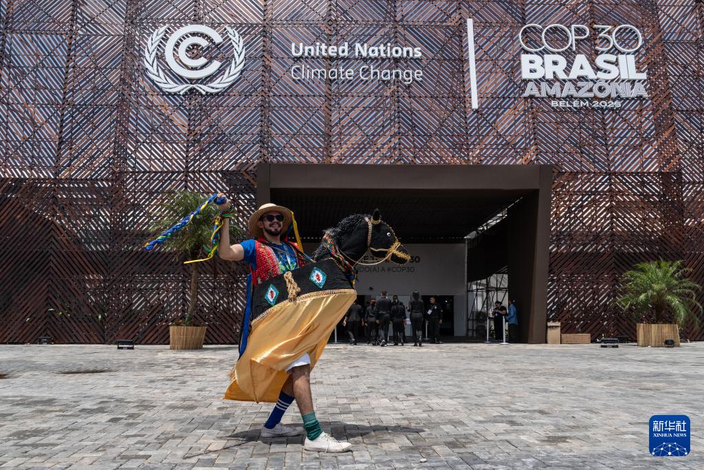 11月6日,在巴西贝伦,身着传统服饰的表演者在《联合国气候变化框架公约》第30次缔约方大会贝伦气候峰会会场外表演。