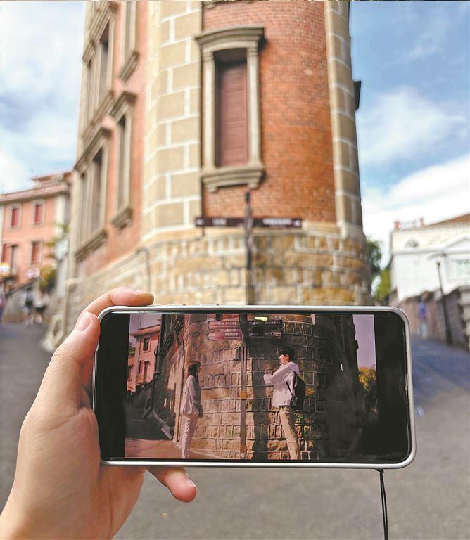 鼓浪屿“最美转角”是电视剧《暗恋·橘生淮南》中的浪漫地标,游客将手机屏幕中的剧照和现场原址对比拍照留念。