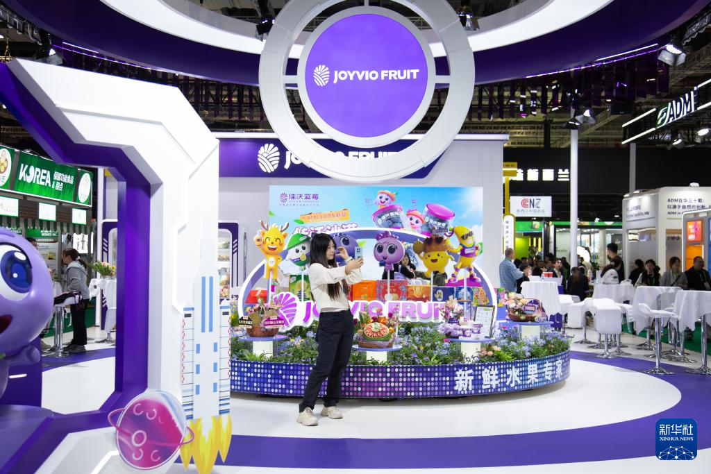 11月10日,在农食产品展区的一个展台,一名参观者自拍留念。