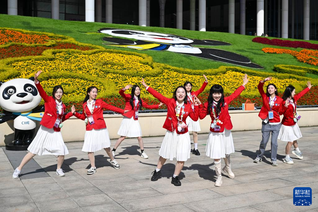 11月10日,志愿者在第八届进博会举办地——国家会展中心(上海)南广场跳舞。