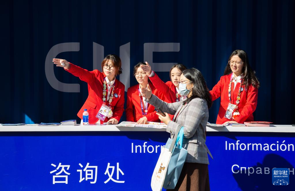 11月10日,志愿者在国家会展中心(上海)为参观者提供服务。