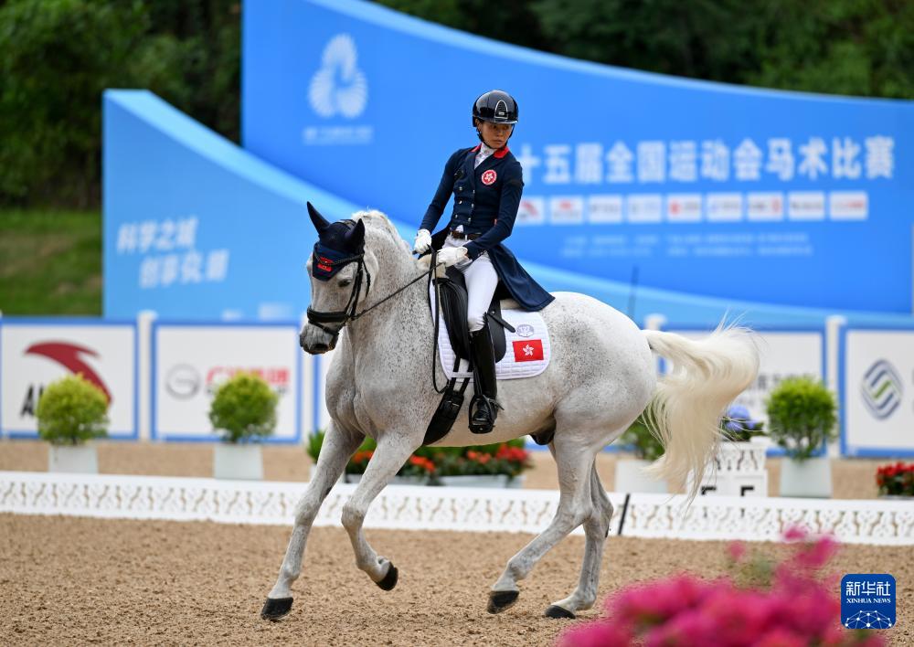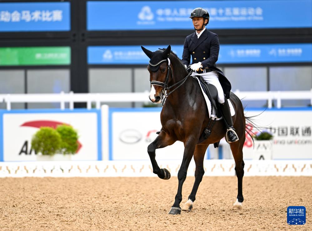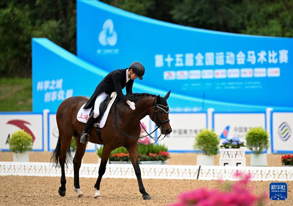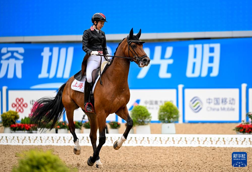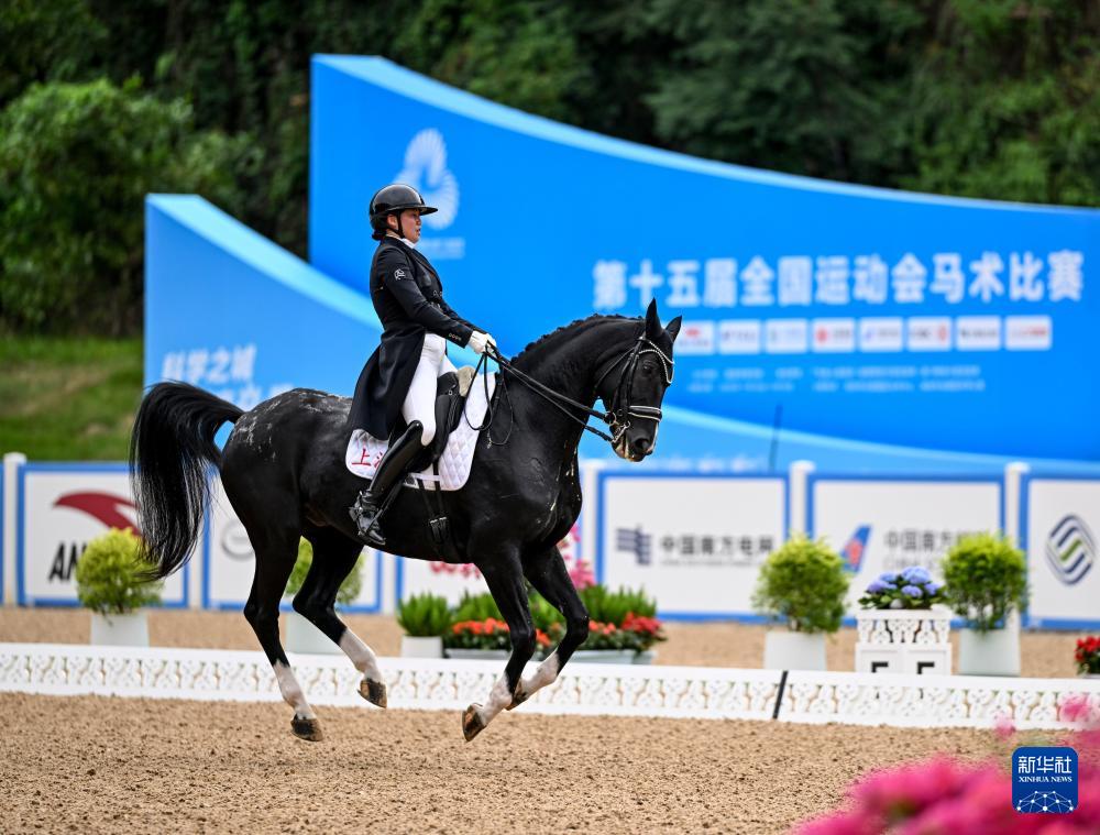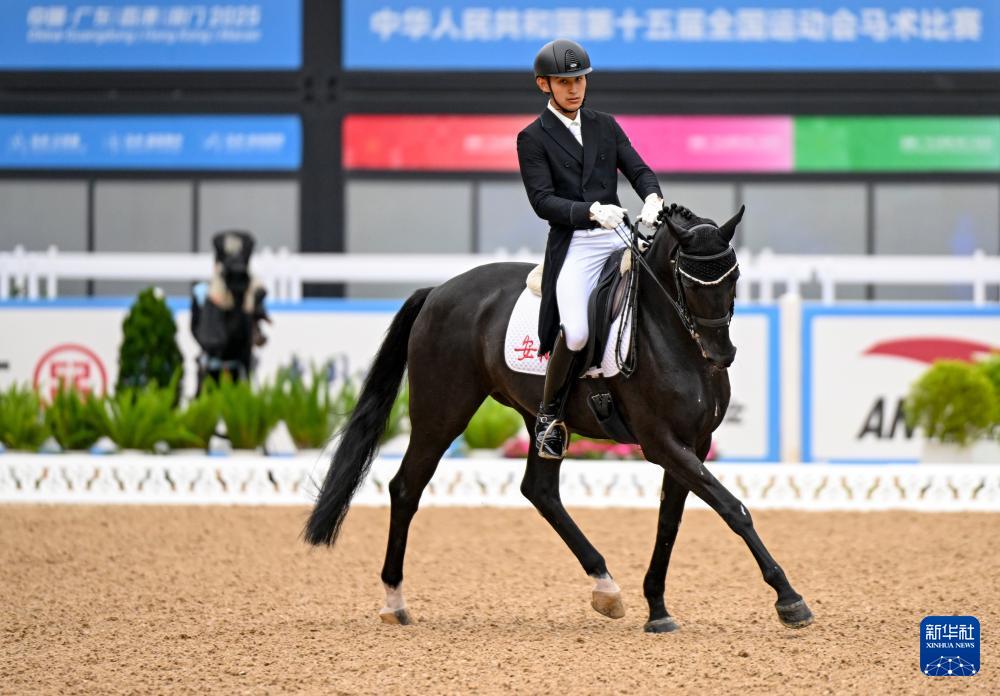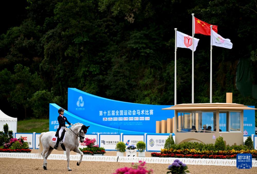 当日,第十五届全国运动会马术比赛盛装舞步个人赛预赛在广东深圳光明国际马术中心举行。