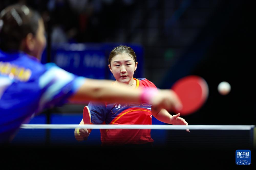 11月11日,孙铭阳(左)与陈梦在比赛中。