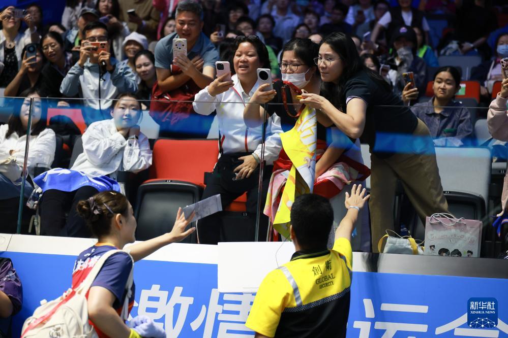 11月11日,陈梦(前左)在比赛结束后与观众互动。