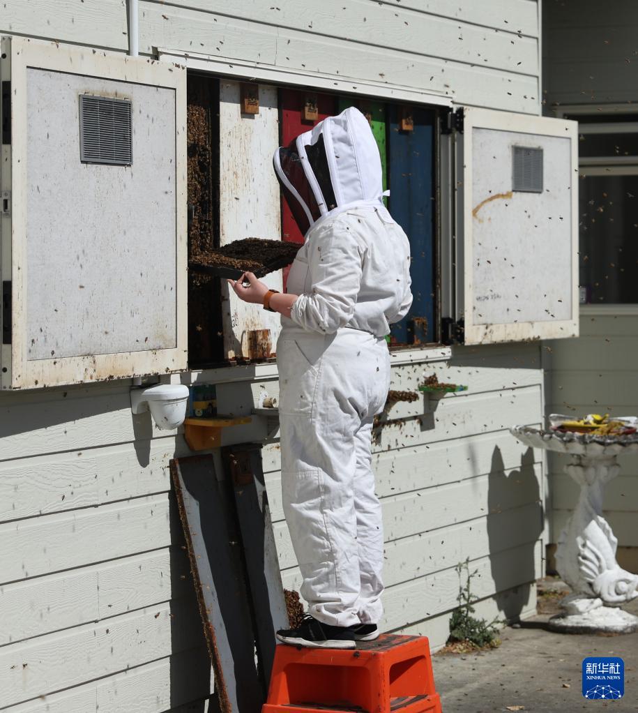 10月29日,在新西兰北岛一家蜂蜜生产企业的展示区,工作人员检查蜂后的健康状态。