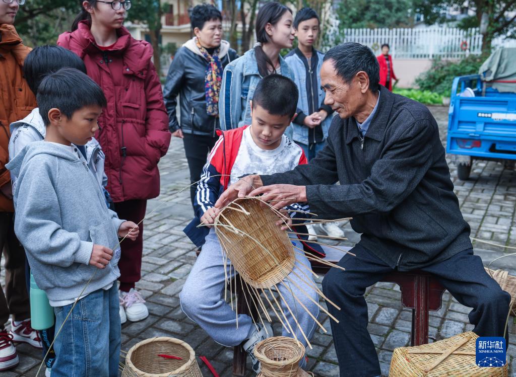 11月12日,在长兴县泗安镇罗家地村的文化广场,竹编艺人指导学生们学习竹编技艺。