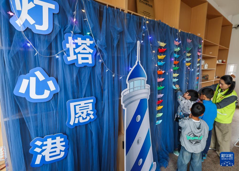 11月12日,在长兴县泗安镇罗家地村的爱心驿站里,学生们把折好的彩色纸船挂在心愿墙上。
