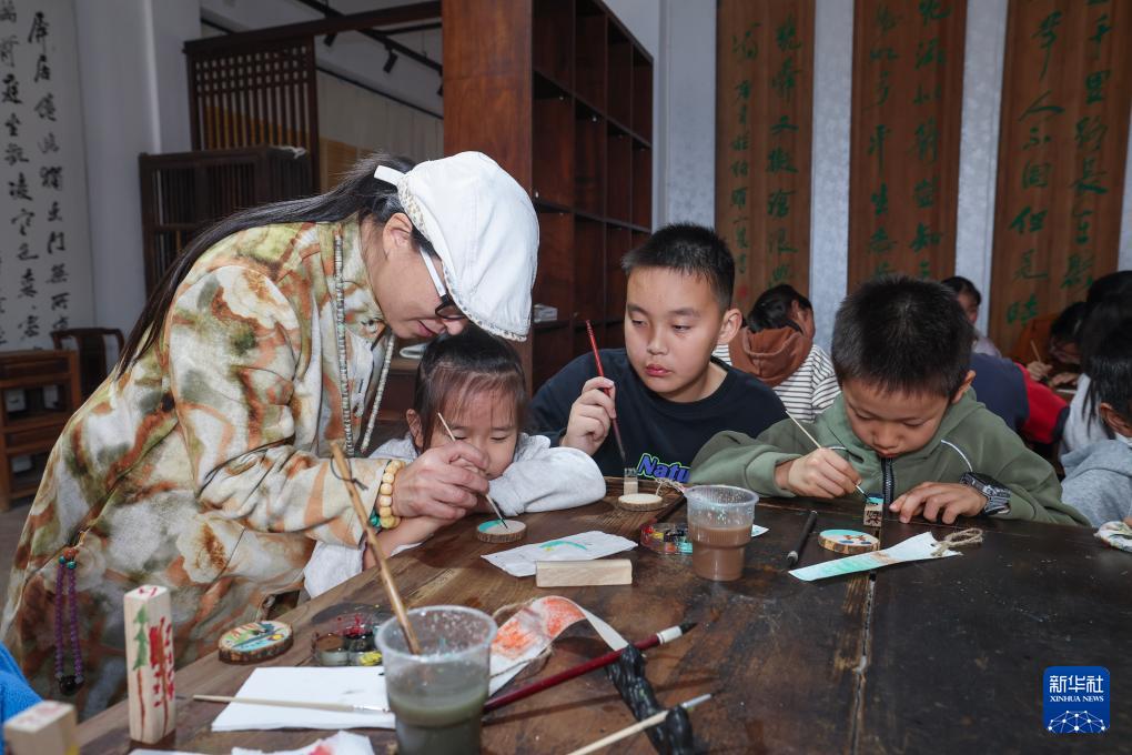 11月12日,在长兴县泗安镇罗家地村的爱心驿站里,国家一级美术师李希玲(左一)指导学生们在木条上进行绘画创作。