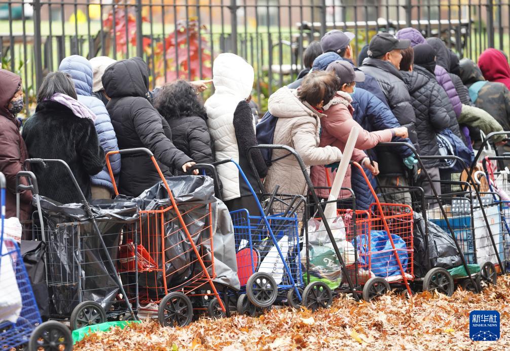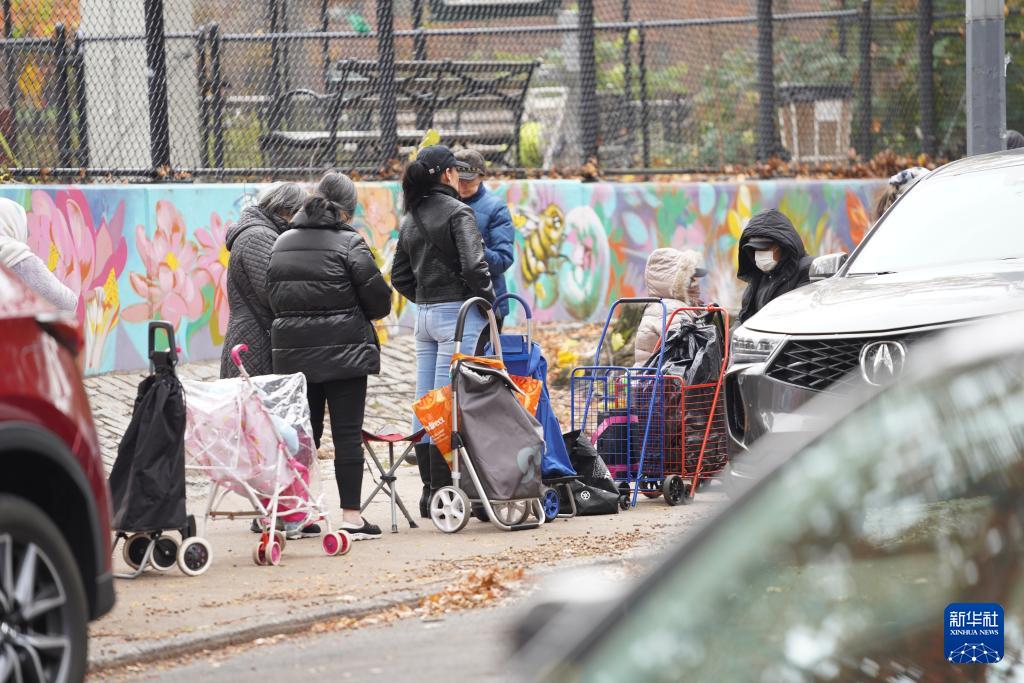 11月12日,人们在美国纽约一处食物发放点领取食物。