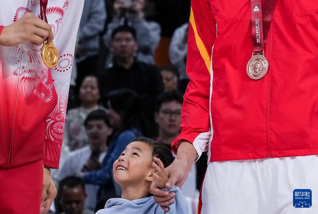 11月12日,四川队球员周琦(右)的孩子看着广东队球员沈梓捷(左)的金牌。