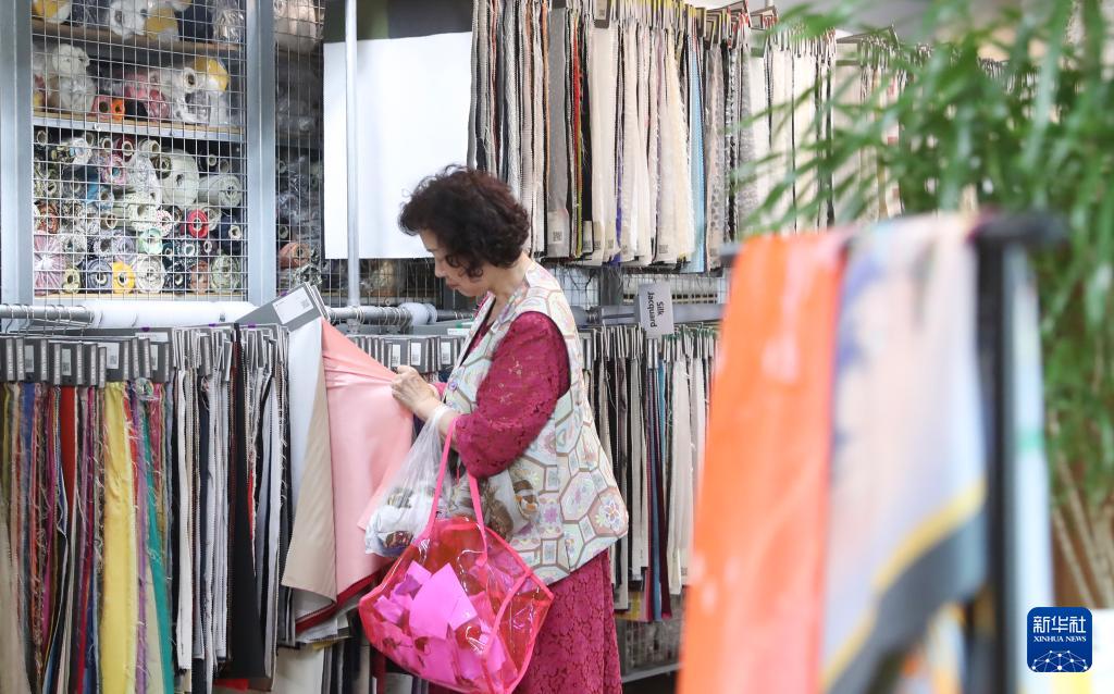 10月2日,消费者在韩国首尔广藏市场一家经营韩服面料的店铺选购。