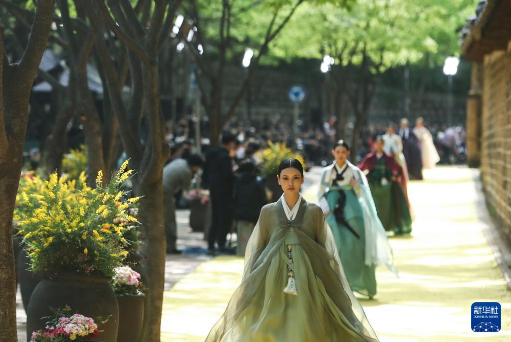 5月2日,在韩国首尔德寿宫边的石墙路,模特身着韩服进行时装表演。