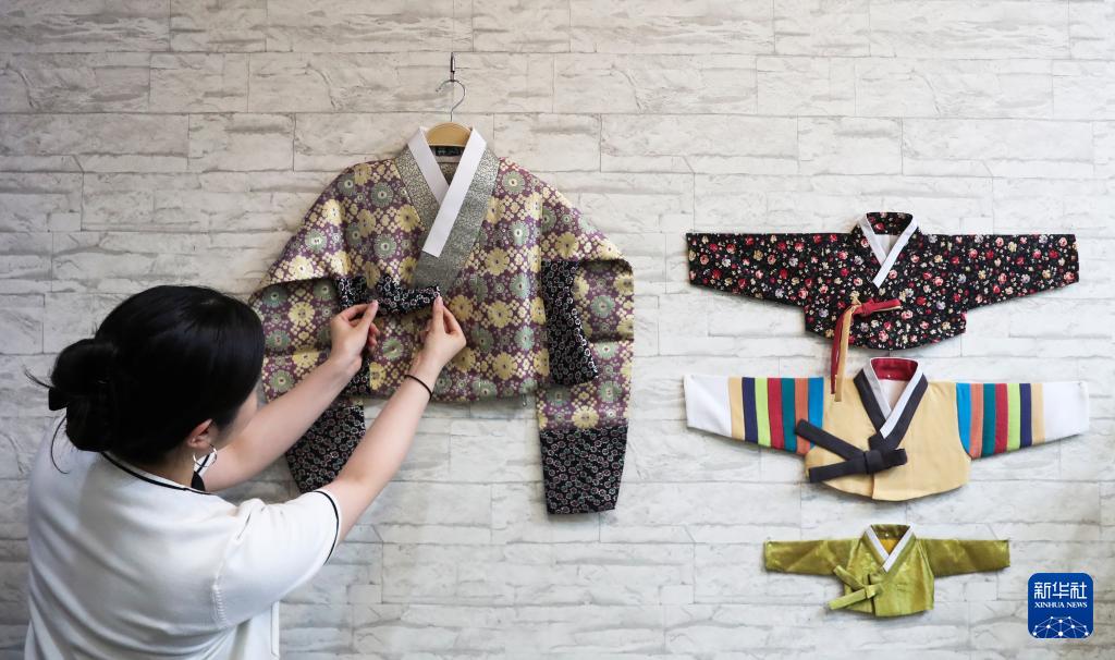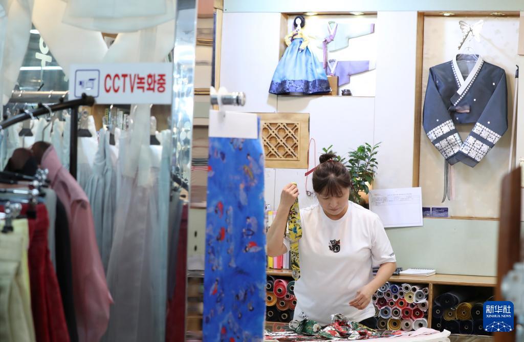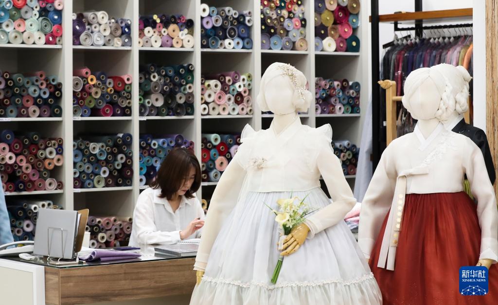 10月2日,在韩国首尔广藏市场,一家韩服店的店员在工作中。