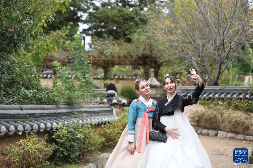 10月16日,模特身着韩服在韩国庆州的景区校村附近合影。
