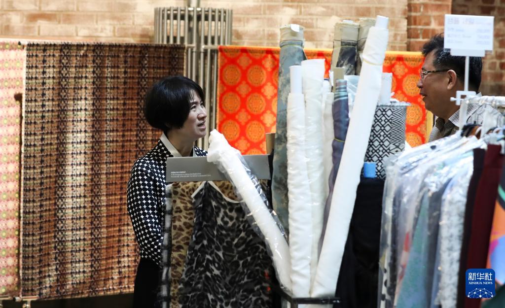10月2日,在韩国首尔广藏市场一家经营韩服面料的店铺,店主(左)向顾客推荐商品。