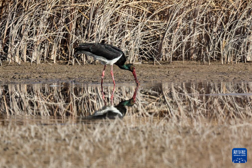11月12日,黑鹳在张掖黑河湿地国家级自然保护区高台段一处湿地浅滩觅食。