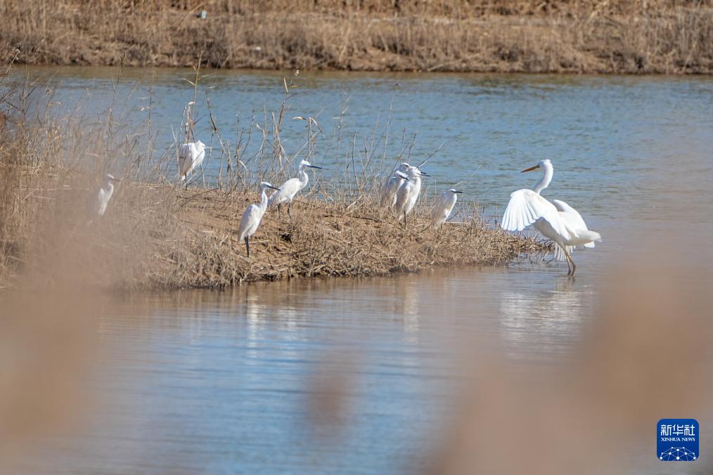 11月13日,在黄河三角洲国家级自然保护区,白鹭在湿地休憩。