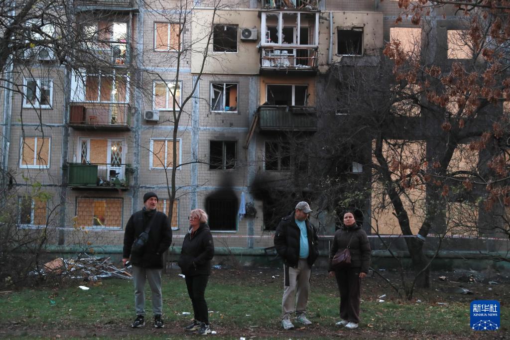 11月14日,在乌克兰首都基辅市第聂伯区,当地居民站在遭受空袭损毁的房屋前。