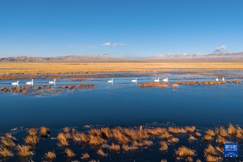 11月14日,大天鹅在甘肃省阿克塞县小苏干湖省级候鸟自然保护区游弋觅食(无人机照片)。
