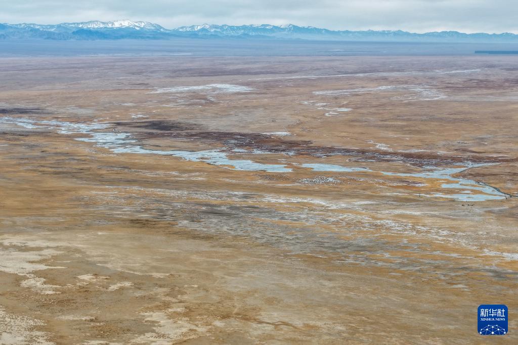 这是11月16日在甘肃省酒泉市阿克塞县阿伊纳乡拍摄的连接大、小苏干湖的水道(无人机照片)。